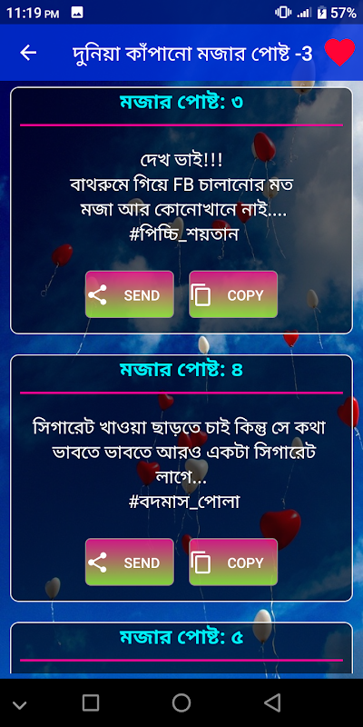 দুনিয়া কাঁপানো মজার পোষ্ট অ্যাপসটি আপনাদের দিবে নতুন হাসির পোষ্ট আর ক্যাপশন । এই বারের থাকছে ফানি পোস্ট, এস.এম.এস, স্ট্যাটাস এন্ড ক্যাপশন নিয়ে আমাদের এই অ্যাপস। এই অ্যাপসটিতে যে সব মজার পোষ্ট আর ক্যাপশন আছে তা আপনি আপনার বন্ধদের সাথে ১ কিল্কে কপি এবং শেয়ার করতে পারবেন ।
