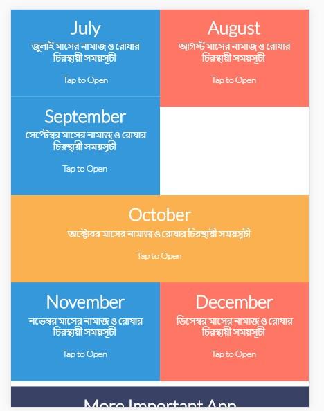 চিরস্থায়ী ক্যালেন্ডার এখন আর পকেটে করে ঘোরার দরকার নেই। আপনার জেলার জন্য যে কোন তারিখের নামাজের আউয়াল ওয়াক্ত এর সময় জানতে পারবেন । জানতে পারবেন ইফতার, সেহরির সময়, তাহাজ্জুদের শেষ সময়, ইশরাকের শুরু সময় ইত্যাদি।