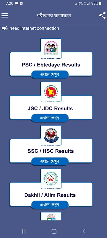 با استفاده از این برنامه، نتایج تمام امتحانات شورای آموزش بنگلادش (PSC، Ibtedayi، JSC، JDC، SSC، Dakhil، HSC، Alim، Degree، Honors، دانشگاه آزاد بنگلادش) در چند لحظه مشخص خواهد شد. . با استفاده از برنامه، نتایج HSC منتشر شده از آرشیو نتایج هیئت آموزش بنگلادش را می توان در یک لحظه مشخص کرد. تعداد و نمرات کسب شده برای هر رشته را می توان با نوبت و شماره ثبت نام خود داوطلب یا فقط با شماره نوبت امتحانی مشخص کرد. این برنامه به شما کمک می کند تا به نتایج آموزشی دست یابید. ما در تلاش هستیم تا آخرین اخبار یا اطلاعات در مورد نتایج آموزشی را در اختیار شما قرار دهیم. این برنامه بسیار سریع کار می کند. این یک برنامه عالی برای کسانی است که واقعاً دوست دارند نتایج آزمایش خود را از یک برنامه پیدا کنند.