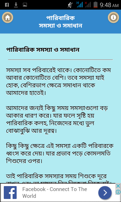 Family problems are common in Bangladesh. A family may fall in worst situation by any problem. So generally we find solution. Only if you know the solution of a problem then you can solve the problem. In this app, many family problems and solution are included. So use this app and get your desired solution.