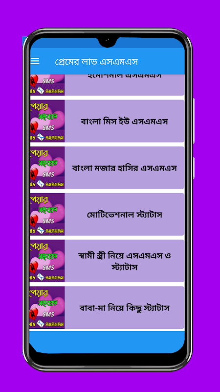 ভালোবাসার প্রেমের এসএমএস ও স্ট্যাটাস দিয়ে সাজানো হয়েছে এই অ্যাপটি.