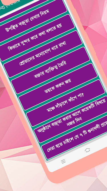 আমরা অনেকেই টেবিল টক বা সামনাসামনি অনেক কথা বলতে পারি, কিংবা তর্ক করতে পারি। কিন্তু অনেকে বক্তৃতা দিতে পারি না। যারা পারেন না তাদের জন্যই এবারের আয়োজন বক্তব্য দেওয়ার উপায়।এবং সুন্দর করে কথা বলার উপায় নিয়ে ও এখানে আলোচনা করা হয়েছে (বক্তব্য দেওয়ার উপায়) এই অ্যাপে।