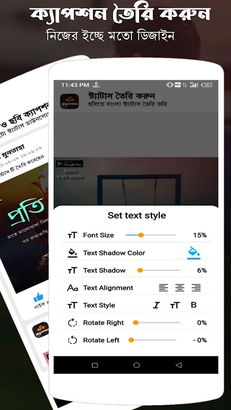 বাংলা স্ট্যাটাস ছবি ক্যাপশন নিজের ইচ্ছে মতো ডিজাইন করা যাবে এবং ক্যাপশন সংরক্ষণ করা যাবে।