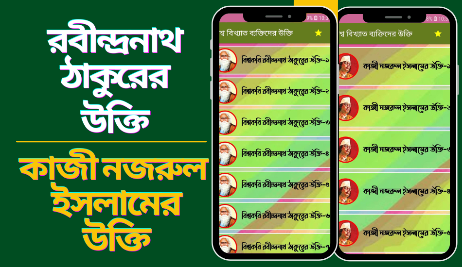 نقل قول های عاقلانه از مردان مشهور به شما دیدگاه جدیدی می دهد و روند فکری و جهان بینی شما به سطح جدیدی می رسد که شما را فردی عاقل تر و باهوش تر می کند. این برنامه نقل قول بنگالی یا برنامه bangla bani kotha یک معدن طلا برای کسانی است که به دنبال دانش و انگیزه برای زندگی بهتر هستند.