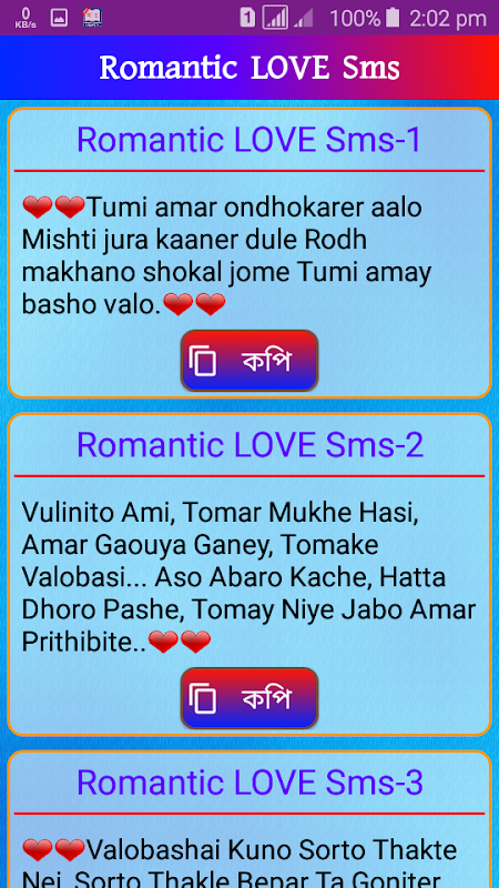 প্রত্যেকেরই একজন পছন্দের মানুষ থাকে কিন্তু কয় জনই বা পারে তার পছন্দের মানুষটিকে তার ভালোবাসার কথা জানাতে। মনে রাখবেন যে কোনো কেউই আপনার প্রেমে পরবে কিন্তু সেজন্য আপনাকে বিভিন্ন টেকনিকে আপনার পছন্দের মানুষটির মন জয় করে নিতে হবে। তাই আপনারা আমাদের অ্যাপটির মাধ্যমে খুব সহজেই পছন্দের মানুষের মন জয় করার টেকনিক শিখতে পারবেন। এছাড়াও আমাদের অ্যাপটির মাধ্যমে আপনারা আপনার পছন্দের মানুষের মন জয় করার সকল ধরনের রোমান্টিক এসএমএস পাবেন।