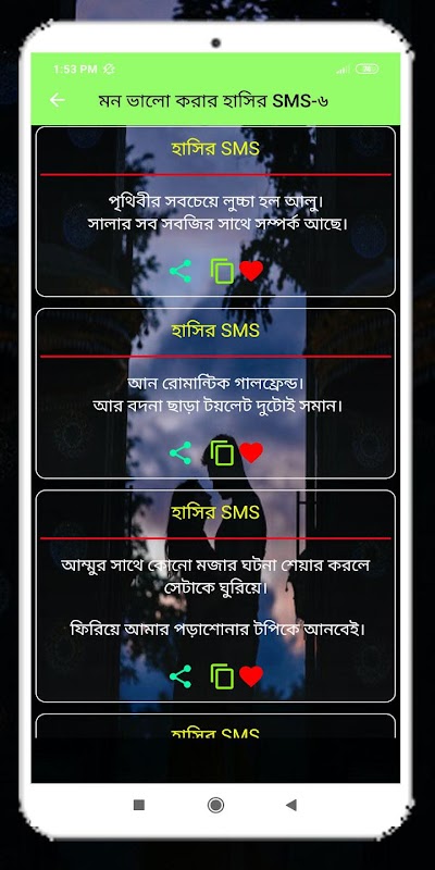 মন ভালো করার- اس ام اس এই অ্যাপসটি থেকে আপনারা ভালোবাসর মানষকে দেয়ার মত সকল ধরনের রোমান্টিক কষ্টের কষ্টের SMS পাবেন আপনার মনের মানুষটিকে শেয়ার করে মন ভালোকরতে বা সব সময় হাসাতে পারেন। কথাগুলো খুব সুন্দর ভাবে প্রকাশ করার জন্য আমাদের অ্যাপটি ব্যবহার করতে পারেন। আবেগী কষ্টের কথা বলে আরো ভালোবাসা পেতে পারেন।