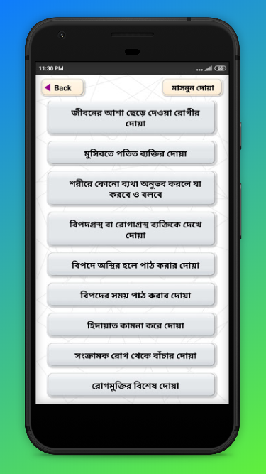 আমাদের অ্যাপটিতে কোনও প্রকার পাঠ্যবইয়ের এর সহায়তা ছাড়াই জেনে নিন প্রয়োজনীয় কয়েকটি দোয়া( duaas) । পুরো দিন দোয়া দ্বারা ঘেরা- দিনের শুরুতে মানে ঘুম হতে ওঠতে দোয়া(masnoon dua) দিনের শেষে মানে ঘুমানোর দোয়া(masnoon doa), ঘরে হতে বের হতে দোয়া(masnun dua), ঘরে প্রবেশ করতে দোয়া, মসজিদে প্রবেশের দোয়া, মসজিদ হতে বের হওয়ার, গাড়িতে ওঠার দোয়া, মা-বাবার জন্যে দোয়া,খাওয়ার দোয়া,সকল রোগ থেকে মুক্তির দোয়া(rog muktir doa),মহামারী থেকে বাচার দোয়া,বিপদ থেকে মুক্তির দোয়া,কঠিন রোগ থেকে মুক্তি পাওয়ার দোয়া ইত্যাদি।এই সব প্রতিদিনের দোয়া(daily dua),সকল প্রকার রোগ থেকে মুক্তির দোয়া(rog muktir dua) এবং প্রয়োজনীয় দোয়াগুলো( important dua)পদে পদে আপনাকে পাপ কাজ করতে বাধা দেবে।