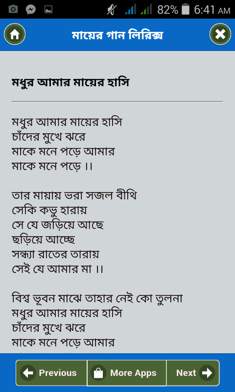 মায়ের গান শুনলে আমাদের সকলেরই শরীরের লোম দারিয়ে যায় কারন প্রত্যেকটি মা নিয়ে গানই মায়ের ত্যাগ এবং আমাদের জন্য কষ্টের কথা বলে তাই মা নিয়ে এই সকল গানগুলো মায়ের প্রতি আমাদের দায়িত্ব আরও বেশি করে বারিয়ে দেয়। আপনি শুনে খুশি হবেন যে আমাদের এই অ্যাপ এর সকল বাংলা গান বিশেষভাবে যাচাই বাছাই করে নির্বাচিত।
