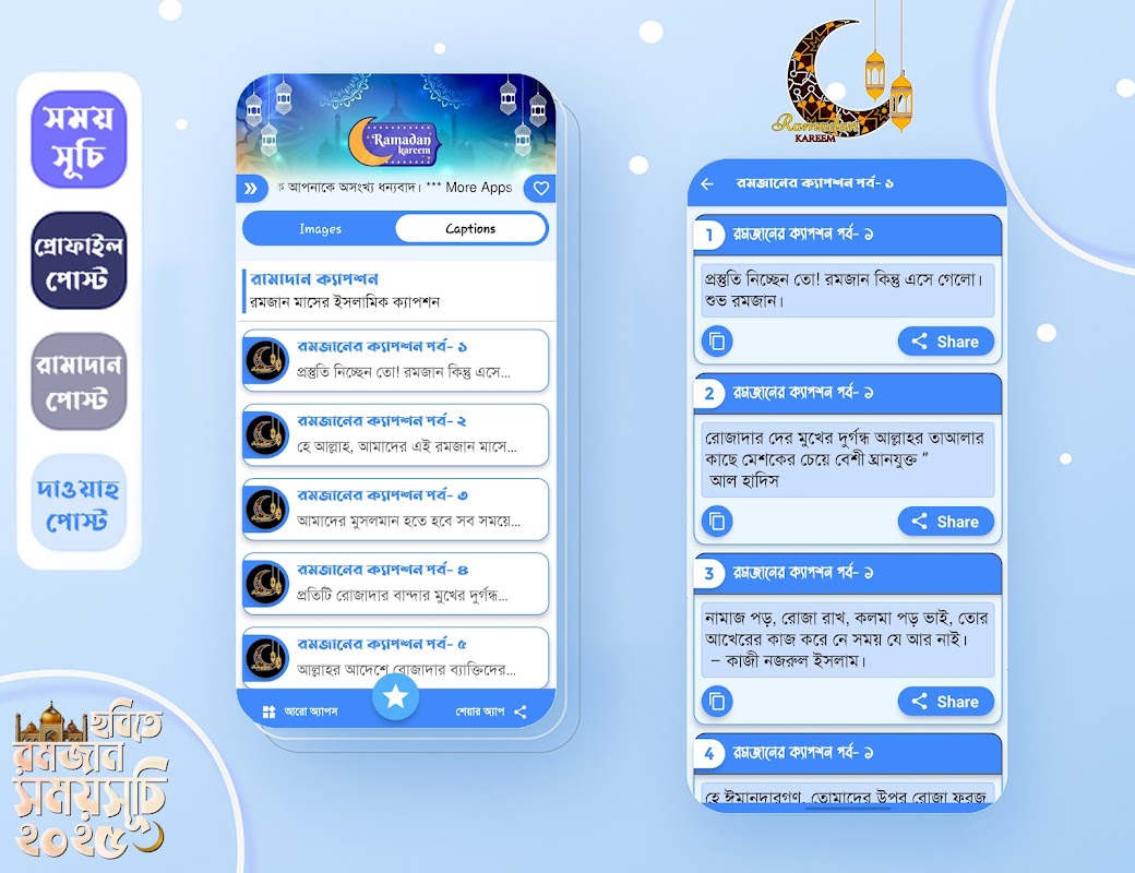 রমজান প্রত্যেক মুসলমানদের কাছে অত্ ্বপূর্ণ একটি মাস। এই মাসে যত গুনা আছে সব গুলো মাফ করাফ করে ওনে র্ণ সুযোগ তৈরি হয়। তাই প্রত্যেক প্রাপ্তবয়স্ক মুসলিিস্ রোজা রাখা একান্ত কর্তব্য। এর চেয়েও গুরুত্বপূর্ণ ব্যাপার রমজজ াত খবর অন্য একজন মুসলিমকে দেওয়া। তাই পবিত্র রমজানের সুখবর দেওয়ার জন্য উক্ত অ্যাপটিতে আমরা কিছু শুভেচ্ছাবার্তা ও রমজান রমজান পিক পিক (عکس رمضان) সংযুক্ত করে দিয়েছি। আপনি আমাদের এই মাহে রমজানের পিকচার অ্যাপ থেকে রমজানের শুভেচ্ছা বার্তা ، عکس رمضان গুলো সংগ্রহ করে নিজের প্রিয় জন এবং বন্ধু বন্ধু মাঝে মাঝে মাঝে মাঝে মাঝে মাঝে শেয়ার শেয়ার করতে পারবেন।।।।।।। করতে করতে করতে করতে।।। করতে করতে করতে করতে করতে করতে করতে করতে করতে করতে করতে করতে রমজানের সময় সূচি 2025 কে আমরা রমজান মাসের পিক আকারে এমন ভাবে এই অ্যাপের মাধ্যমে উপস্থাপন করেছি যে আপনি খুব সহজেই রমজানের সময় সূচি ছবি সহ ডাউনলোড করে অন্যদেরকে জানালোর জন্য সোশ্যাল মিডিয়াগুলোতে শেয়ার করতে পারবেন। অ্যাপটিতে খুঁজে খুঁজে ভালো মানতর রম স্ট্যাটাস ও এসএমএস দেওয়া হয়েছে।