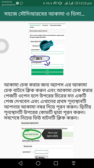 এই অ্যাপস এ চিত্রসহ কিভাবে চেক করতে হবে দেখানো হয়েছ এবং বিস্তারিত আলোচনা করা হয়েছে ।ফলে খুব সহজেই আকামা এবং ভিসা চেক করতে পারবেন।