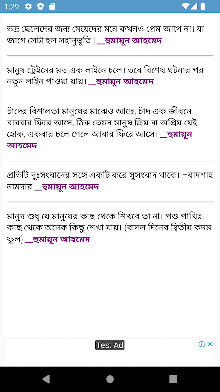 তিনি এখন আমাদের মাঝে নেই তবুও তার কিছু কিছু বা লেখা আজও আমাদের মন কে জয় করে রেখেছে.হুমায়ূন আহমেদ স্যার এর বিখ্যাত সব উক্তি গুলো নিয়ে এই এ্যাপটি সাজিয়ে উনাকে শ্রদ্ধাভরে সরণ করছি.