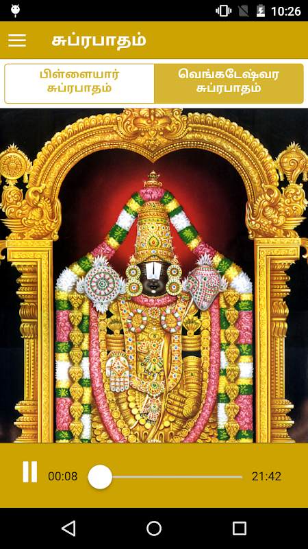 This app contains both Pillaiyar and Venkateshwara suprabhatam songs in tamil.