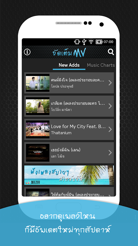 Enjoy the music video of Thai music hits along with its lyric for free! The music charts are from popular Thai radio charts which will be updated regularly. You can also download the Ringtones and Ring Back Tones by calling to the number advertised in each song. We would like to apologize for any errors that might happen. We will keep improving the application as long as you need it.