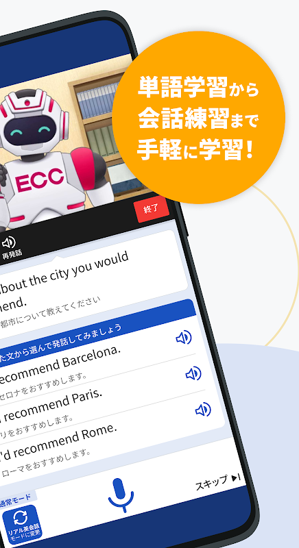 شرکای تمرین مکالمه شخصیت های منحصر به فردی هستند. حرکات و حالات صورت آن بسته به آنچه می گویید تغییر می کند، بنابراین می توانید لذت ببرید و ارتباط طبیعی انگلیسی را تجربه کنید.