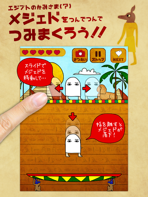 画面上部に現れるいろんなポーズの「メジェドさん」を、クリアラインまで積みあげよう。