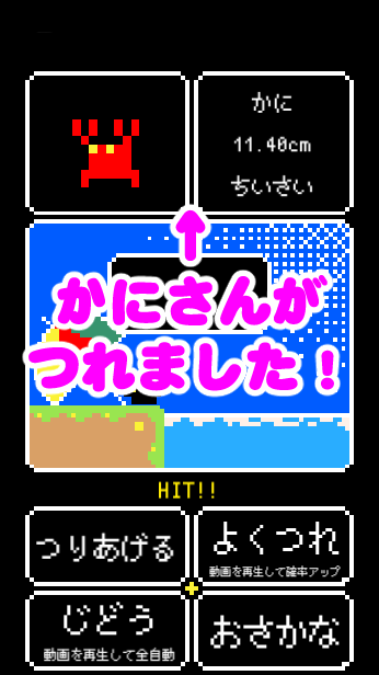 2.黄色い「Hit」の文字が出現したら「つりあげる」ボタンで釣り上げてください。早かったり遅かったりで失敗しますブッブー。