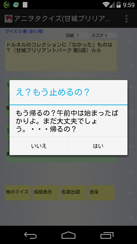 第一弾リリースは第5話分までのクイズ51問でリリースしました。