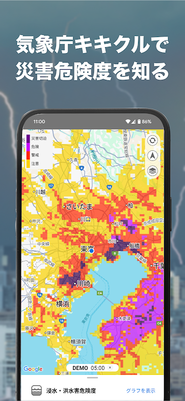 ・ اطلاع رسانی Kikikuru زمانی که خطر فاجعه به دلیل باران شدید در مکان های ثبت شده یا مکان فعلی افزایش می یابد با فشار مطلع می شود.