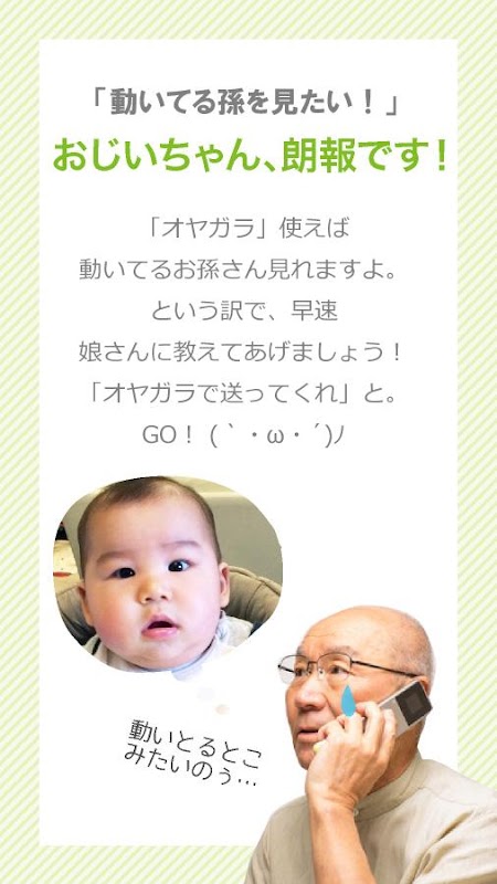 オヤガラは相手がガラケーでも、写真や動画を送ることが出来る、今までありそうでなかったアプリ。