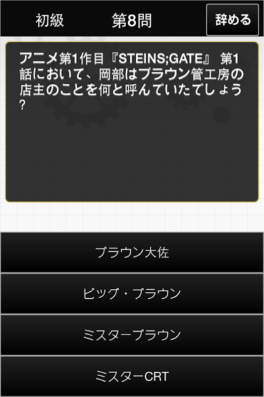 ゲーム、アニメ、劇場版でも大人気のシュタインズ・ゲートに関する四択クイズアプリです。