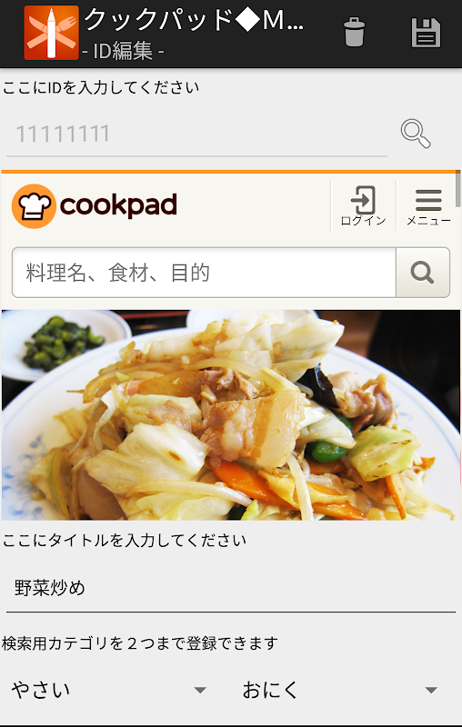 レシピのIDから登録する方法と、レシピのページを開いて登録する方法を用意しています。