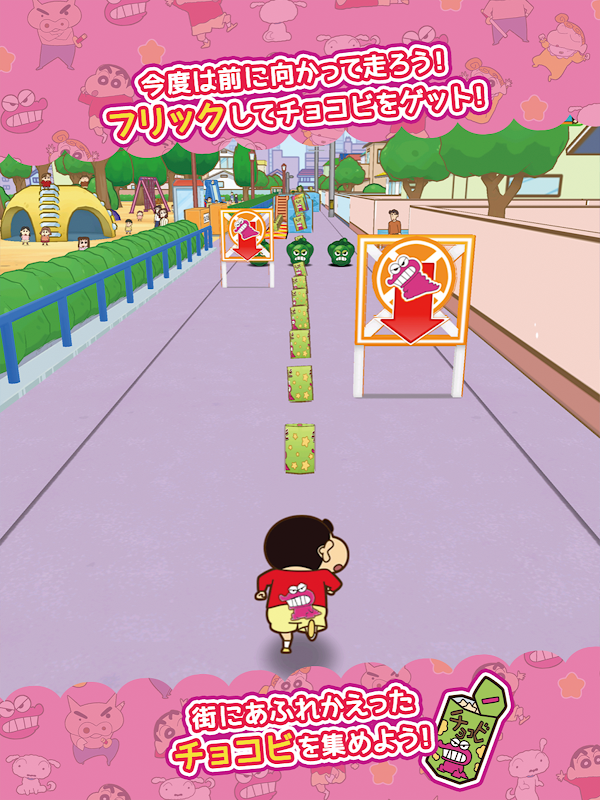 カスカベの街を猛ダッシュするしんちゃんを上下左右に操作し、いろんな障害物をよけながらしんちゃんが大好きなお菓子「チョコビ」をゲットしていくランゲームです。