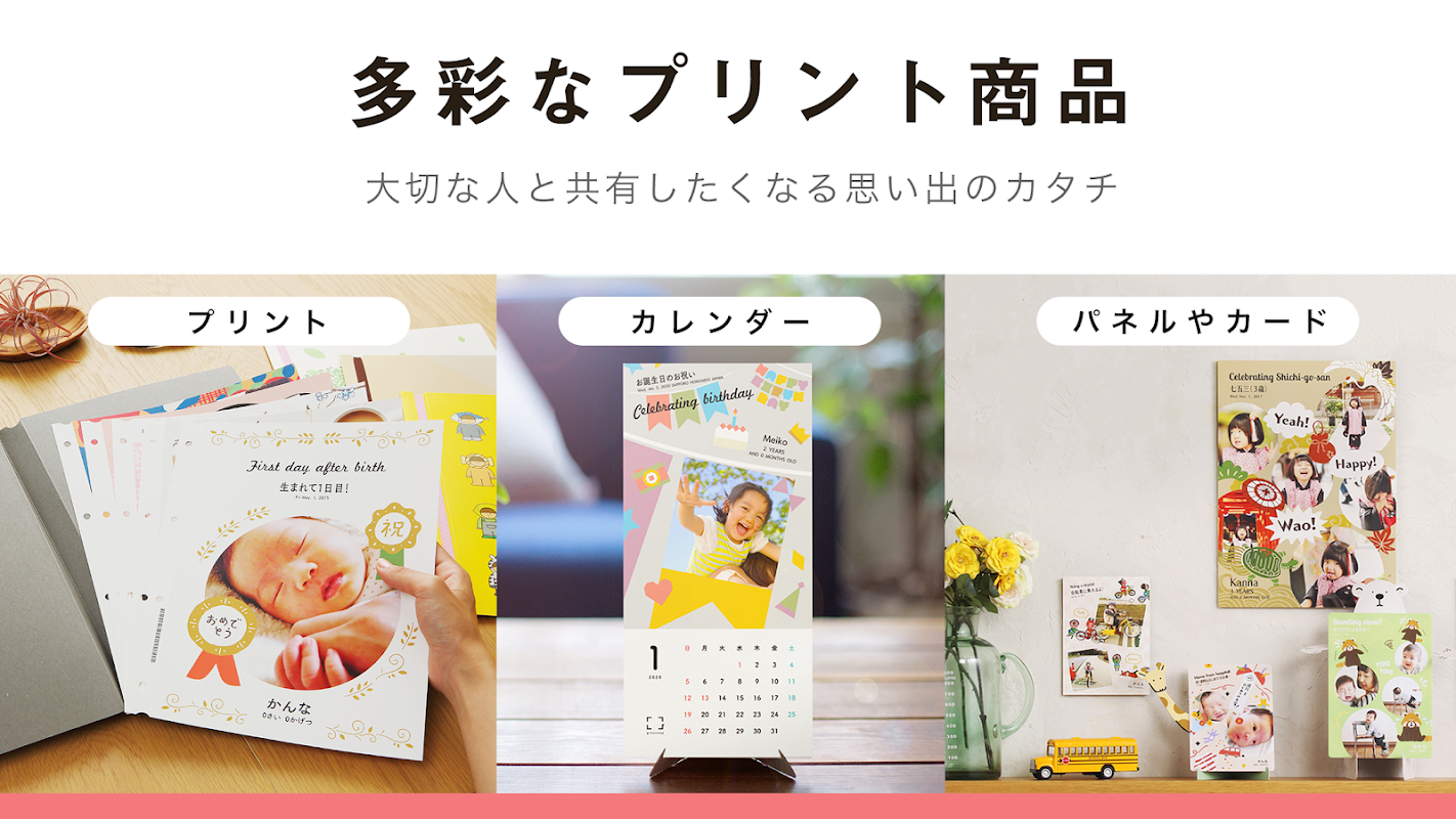 毎月贈るカレンダーやリビングや玄関に飾れるカードやパネル、1年分(50作品)ためることができるバインダーなど、ライフスタイルに合わせたプリント商品で「作品」を思い出として残すことができます。