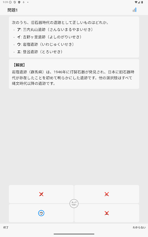 شما می توانید به طور موثر تاریخ ژاپن را برای آزمون رایج مطالعه کنید. امکان حفظ پاسخ های صحیح تا سه سوال گذشته وجود دارد. مرور سوالاتی که اشتباه کردهاید آسان است و توضیحاتی نیز در آن گنجانده شده است، که آن را برای آمادگی برای آزمون مشترک تاریخ ژاپن ایدهآل میکند.