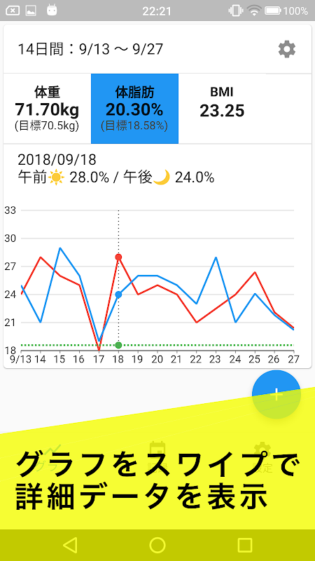 ダイエットや筋トレ、健康管理のために体重や体脂肪をシンプルに記録してグラフで確認! 午前と午後に分けて入力できて日々の変化により気づきやすい体重体脂肪管理アプリ