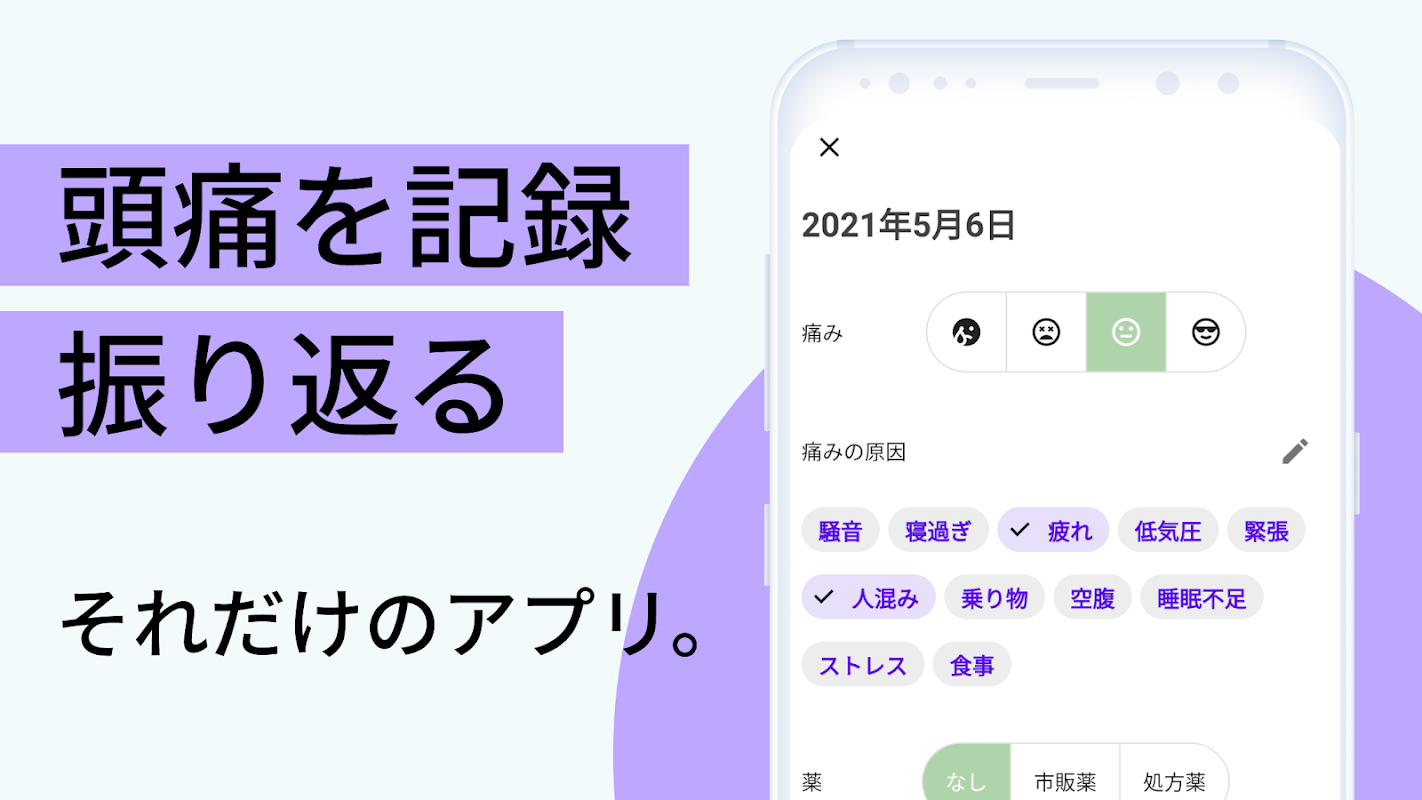 シンプル な 頭痛 記録 アプリ です. 片頭痛 (偏頭痛) に も 対応. 日々 の 頭痛 を 簡単 に 記録 し て 振り返る ことができ ます.