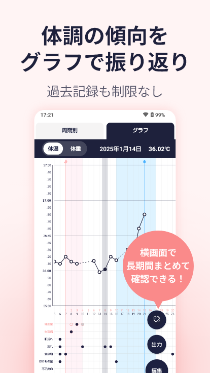 شما می توانید پیش بینی قاعدگی و تاریخ تخمک گذاری خود را در یک تقویم آسان برای درک بررسی کنید. در حالت امید بارداری، پیش بینی تاریخ تخمک گذاری با وضوح بیشتری نمایش داده می شود تا زمان بارداری را از دست ندهید. همچنین می توانید ON/OFF را برای نمایش احتمال بارداری انتخاب کنید.