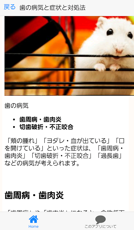 ハムスターの目・鼻・口・皮膚・歯・尿などの症状と対処法を紹介するアプリです。又かかりやすい病気や予防法。大切な命を守って幸せな生活を送らせてあげましょう。
