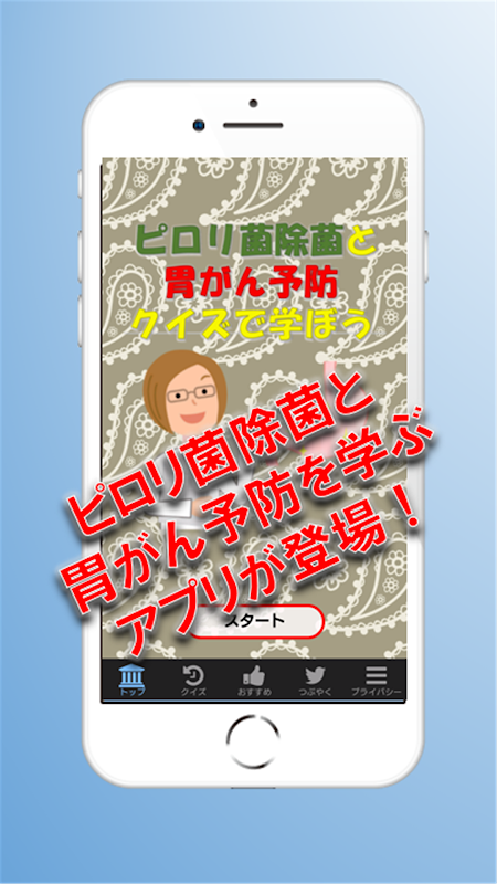 It is an app that lets you learn correct knowledge about Helicobacter pylori bacteria and eradication in quiz format fun.