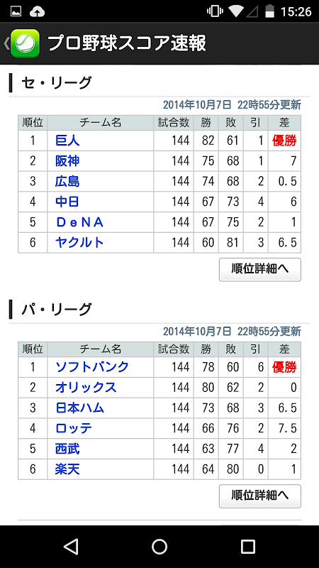 プロ野球速報では、日本プロ野球の試合スコアとスケジュールを見ることができます。試合結果をどうなったのかチェックしたいときにすぐに確認することができます。各試合カードをタップすると、各回に何点入ったのか、得失点や安打数、失策数も見ることができます。