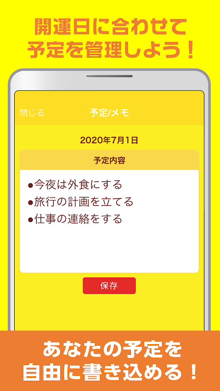 این یک برنامه تقویم با کاربری آسان است که به شما امکان می دهد به سرعت و به طور مستقیم برنامه خود را وارد کنید. اگر تاریخی را که می خواهید برنامه ریزی کنید فشار دهید و نگه دارید، یادداشت شروع می شود تا بتوانید برنامه خود را بنویسید. تاریخی که وارد کرده اید به وضوح در تقویم نمایش داده می شود و به شما در مدیریت برنامه کمک می کند. همچنین، لطفاً از آن به روش خود استفاده کنید، مثلاً با وارد کردن دفترچه خاطرات یا دستور العمل های غذاهای مورد علاقه خود!