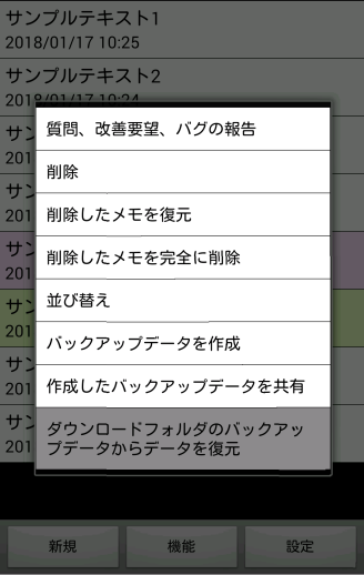 メインストレージの直下にあるデータフォルダ(/NotepadArius)内のファイルが全て正常な状態で存在すれば、当アプリ内部のファイルを復元する事が出来ます。