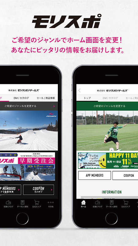 Morispo، یک فروشگاه تخصصی برای اسکی و اسنوبورد، و Stadium Morispo، یک فروشگاه تخصصی برای فوتبال و فوتسال. برنامه جامعی که به شما امکان می دهد به فروشگاه سبکی که استفاده می کنید تغییر دهید!