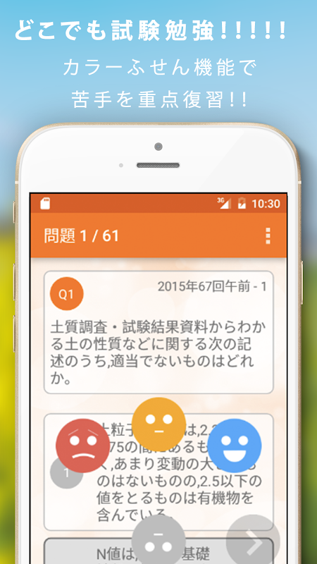 一級土木施工管理技士の過去問題集アプリ。単なる過去問アプリではなく、開催別、分野別、苦手な問題などから独自の問題セットを作成でき重要な項目を徹底的に復習できます