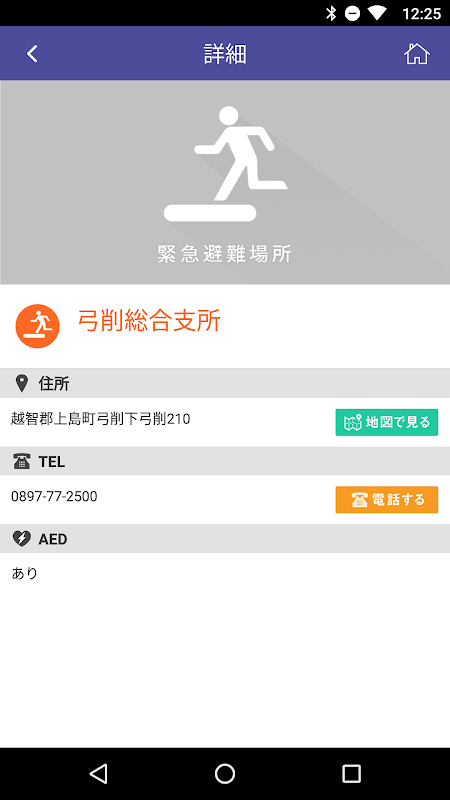 避難スポットを避難所・AED・緊急避難場所のカテゴリ別に分けてリスト画面とマップ画面で表示します。