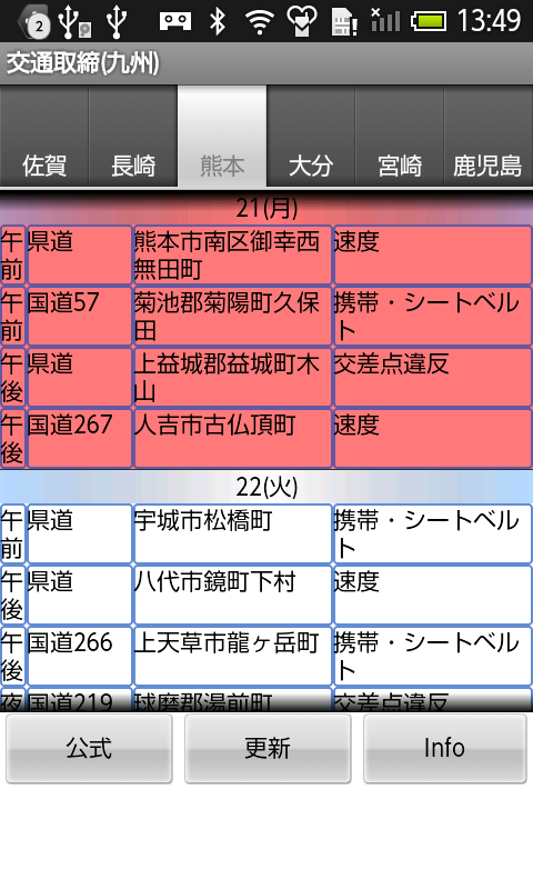 九州エリア(佐賀県、長崎県、熊本県、大分県、宮崎県)の公開交通取締情報を確認するアプリです。