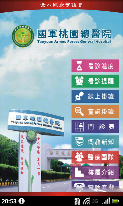 國軍桃園總醫院APP「行動資訊服務系統」,讓您隨時隨地一手掌握就診資訊,包括看診進度、行動掛號、門診表、衛教新知、最新消息、電話快撥等服務,歡迎下載使用。
