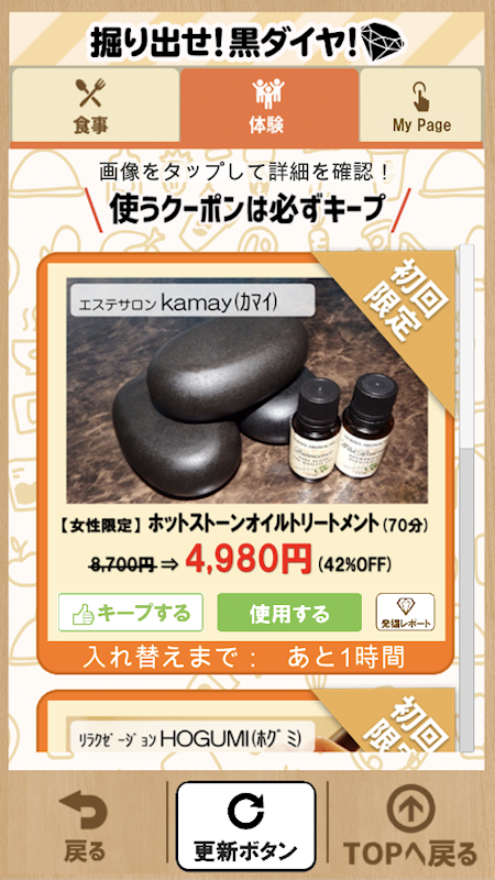「お勧めクーポン」が各カテゴリーで、ランダムに3枚表示されます。「お勧めクーポン」は表示後1時間で入れ替わります。(次回、同じクーポンが配布される可能性あり)使うクーポンはキープしておくと便利です!