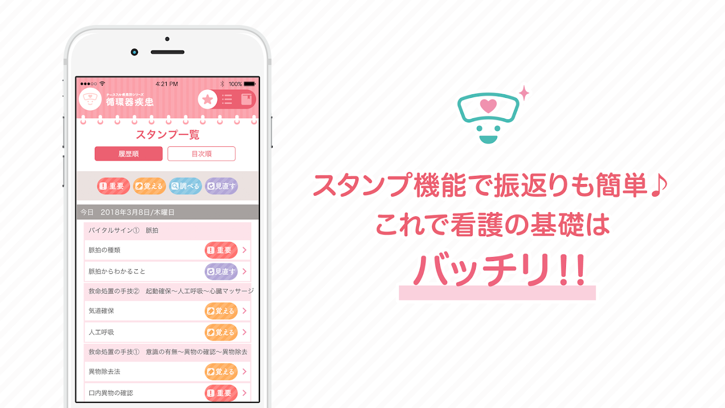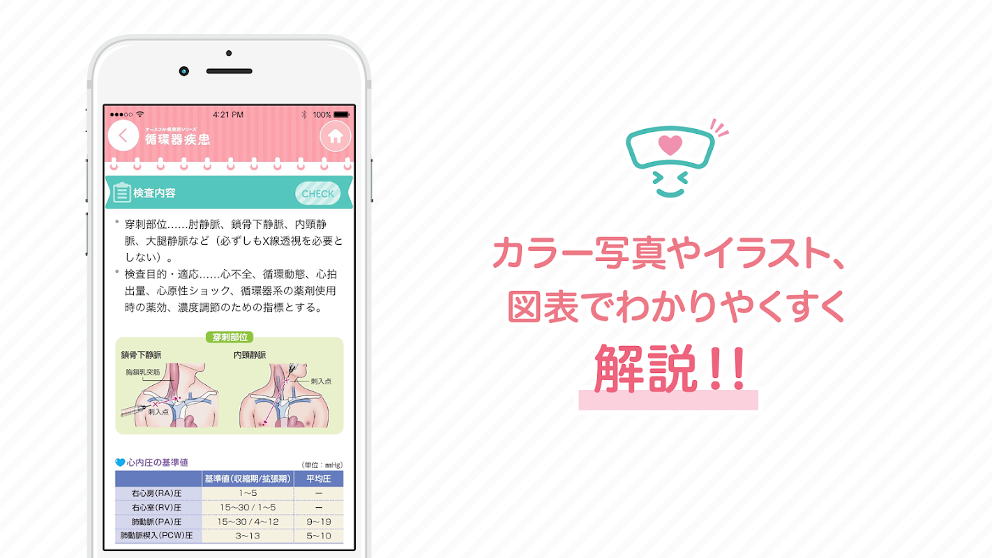 看護師さんが押さえておきたい「循環器疾患」の看護の基礎をいちから学べるアプリ♪わかりやすい解説&使いやすい機能で、多忙な看護師さんのお勉強をしっかりサポート!