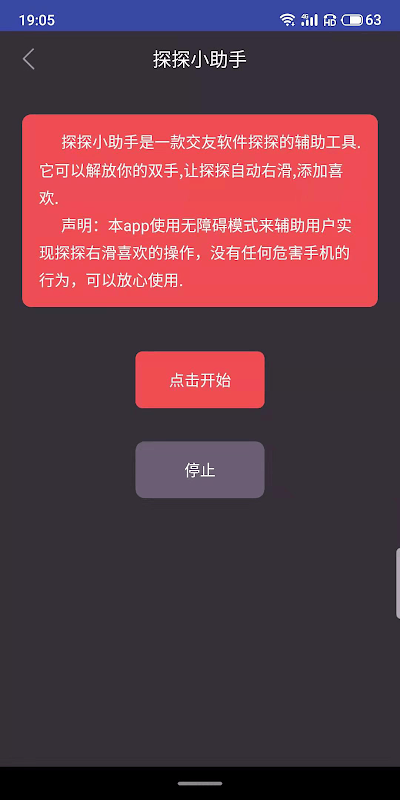本app使用无障碍模式来辅助用户实现探探右滑喜欢的操作,没有任何危害手机的行为,可以放心使用.