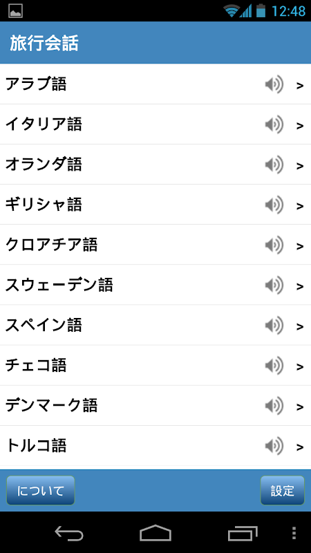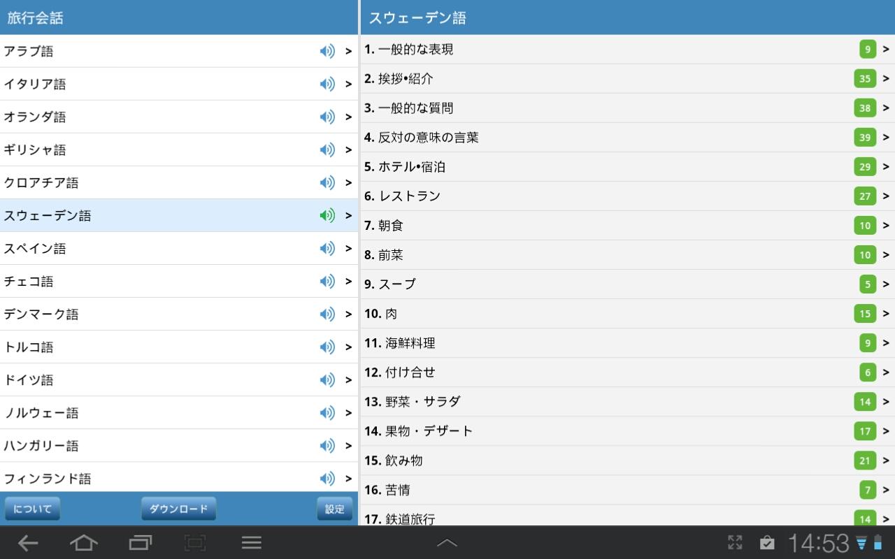 それぞれのテーマはネイティブスピーカーによって用意された文章(フレーズや単語)で構成されています。このテーマには恐らくあなたが旅の道のりで出会うであろう、最も一般的な場面場面が収録されています。単に読むのではなく、聞くことに学習の重点を置き、より簡単に発音の練習ができます。ですから、無理に話そうと苦しむのはやめて、大きい音量で再生するだけで十分です、アプリケーションがあなたの為に‘話’してくれます
