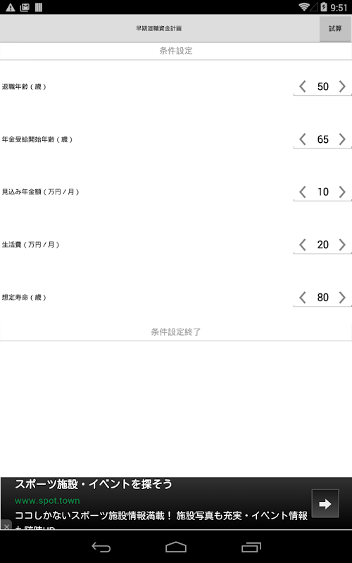 退職予定年齢、想定寿命、想定年金額、年金受給開始年齢、等の条件を入力すると退職後に必要になる資金を試算できます。インフレ等経済状況の変化には対応できないので余裕をもった条件設定が必要です。