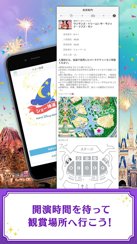 東京ディズニーリゾートで座席指定券が必要なエンターテイメントショーの抽選を、パーク内で、いつでも、どこでも、お好きなタイミングでできるアプリです!