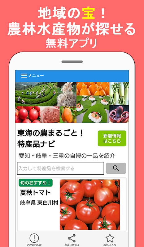 東海の農まるごと!特産品ナビは、農林水産省東海農政局が提供するスマートフォン用アプリケーションです。本アプリを利用することで、東海3県(愛知県、岐阜県、三重県)の自慢の農林水産物やそれを利用した料理・加工食品などの産地、特徴、販売店舗などの情報を簡単に入手することができます。