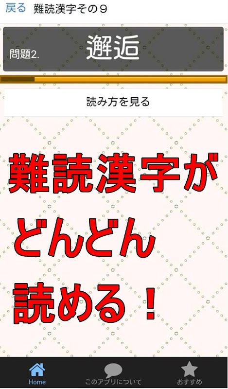 ボタンを押しながら漢字を読み進めていくアプリです。就職試験の対策用として、高校生以上の人が知っておくべき多くの漢字の読み方と意味を短時間で確認できます。