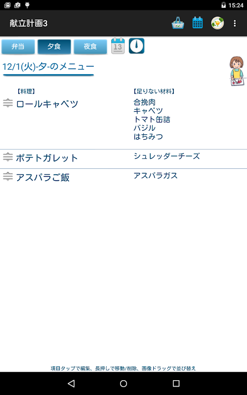 طرح منو 3 یک برنامه منو است که برنامه ها و منوها را ثبت می کند. شما می توانید از مواد لازم، چاشنی، URL دستور غذا یا یک لیست خرید ایجاد کنید.